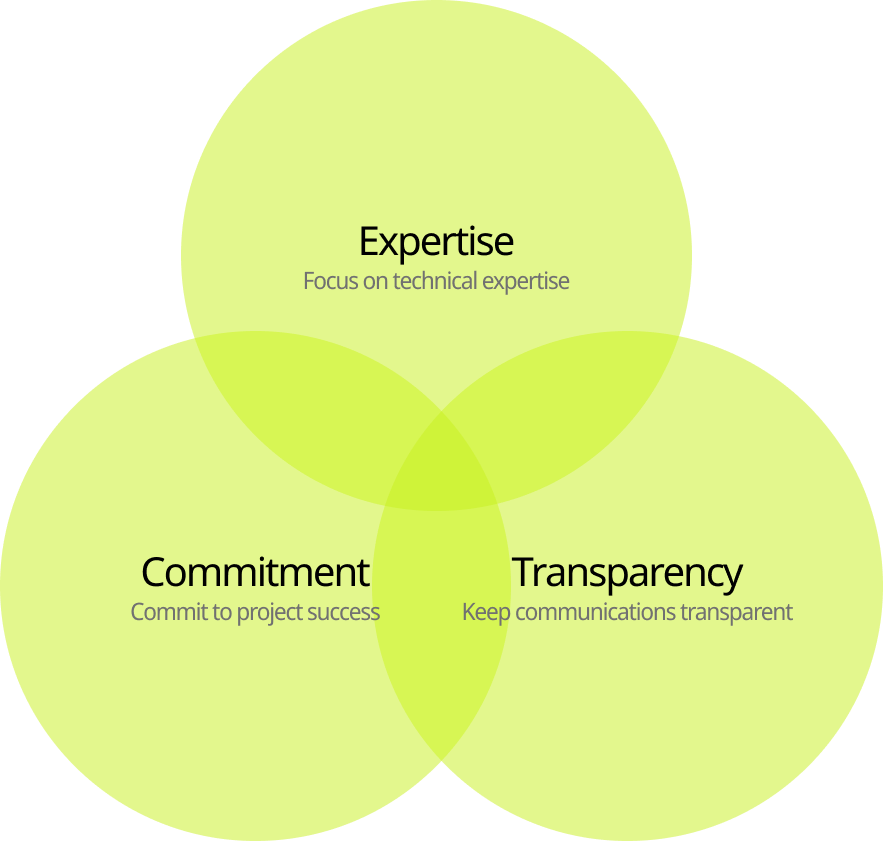 Transparency. Every project starts with trust, and this trust between the Customer and the Service Provider must extend through every stage of the project lifecycle. We keep communications transparent and never look for excuses. We never sell impossible outcomes but always focus on delivering actual value.